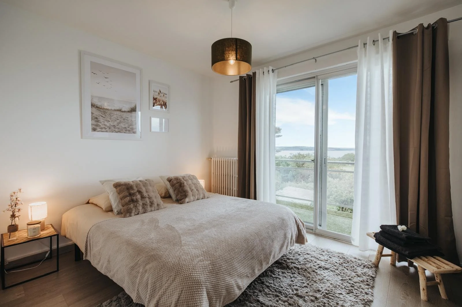 Les teintes naturelles, les draps doux et les rideaux occultants créent un cocon paisible, idéal pour des nuits sereines.